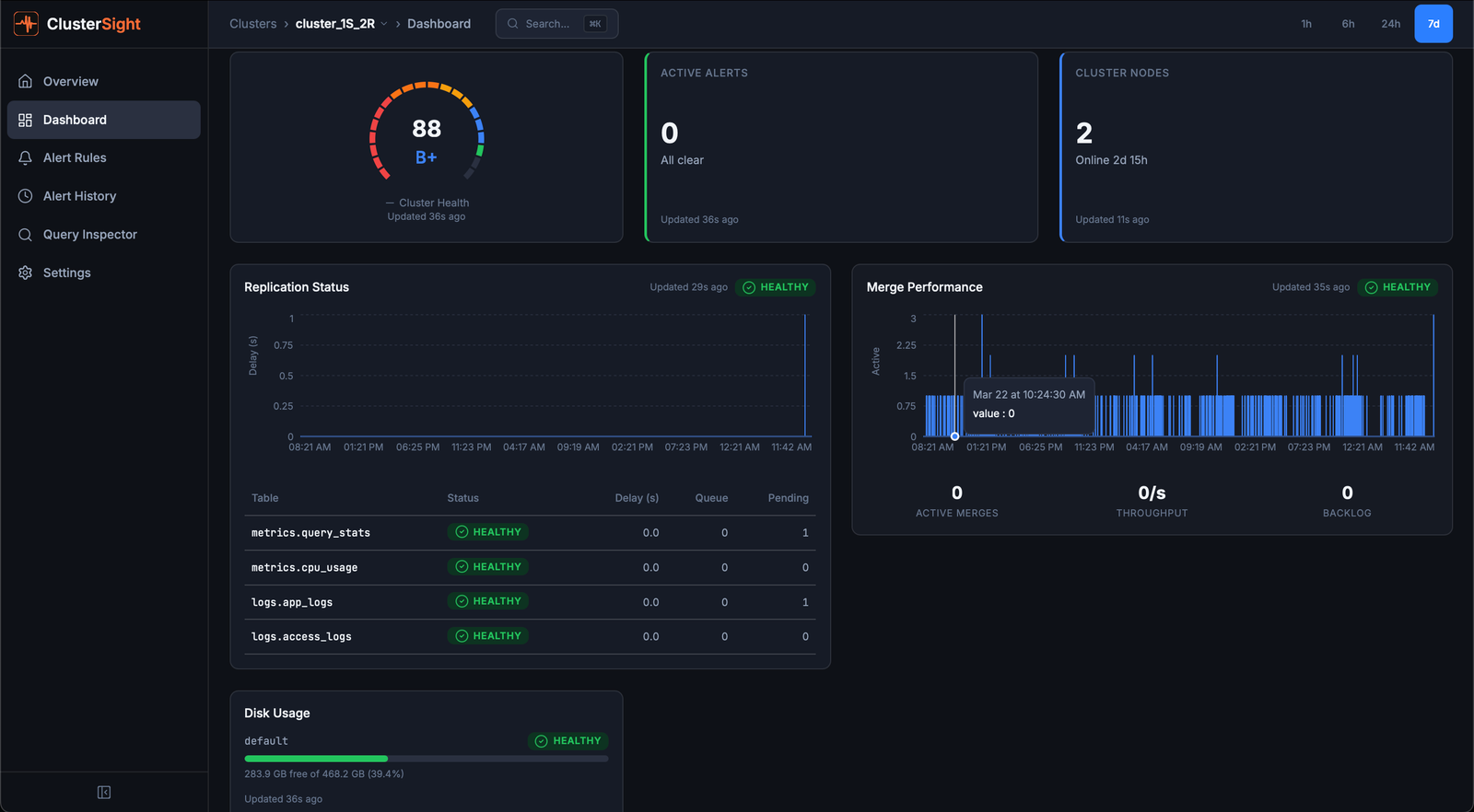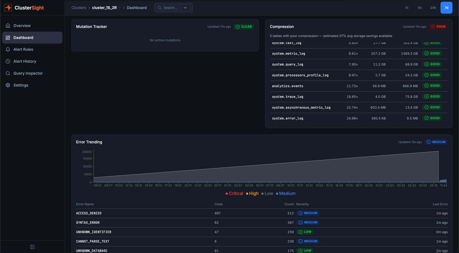 | Query Inspector | Slow queries, failed queries, parts distribution |